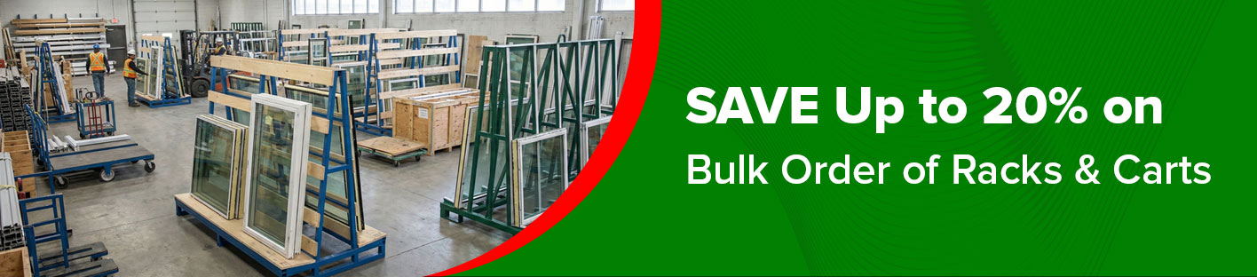Kear Fabrication offers a broad and innovative range of racks and carts for windows, doors, and glass manufacturers. Designed for material handling, storage, and transport, our racks and carts streamline manufacturing processes and improve overall ergonomics for workers. The racks and carts safeguard in-process and finished goods from damage during storage and transport. Moreover, our carts and racks have some specialized features such as safety bars, forklift pockets, padding (for glass protection), and more.