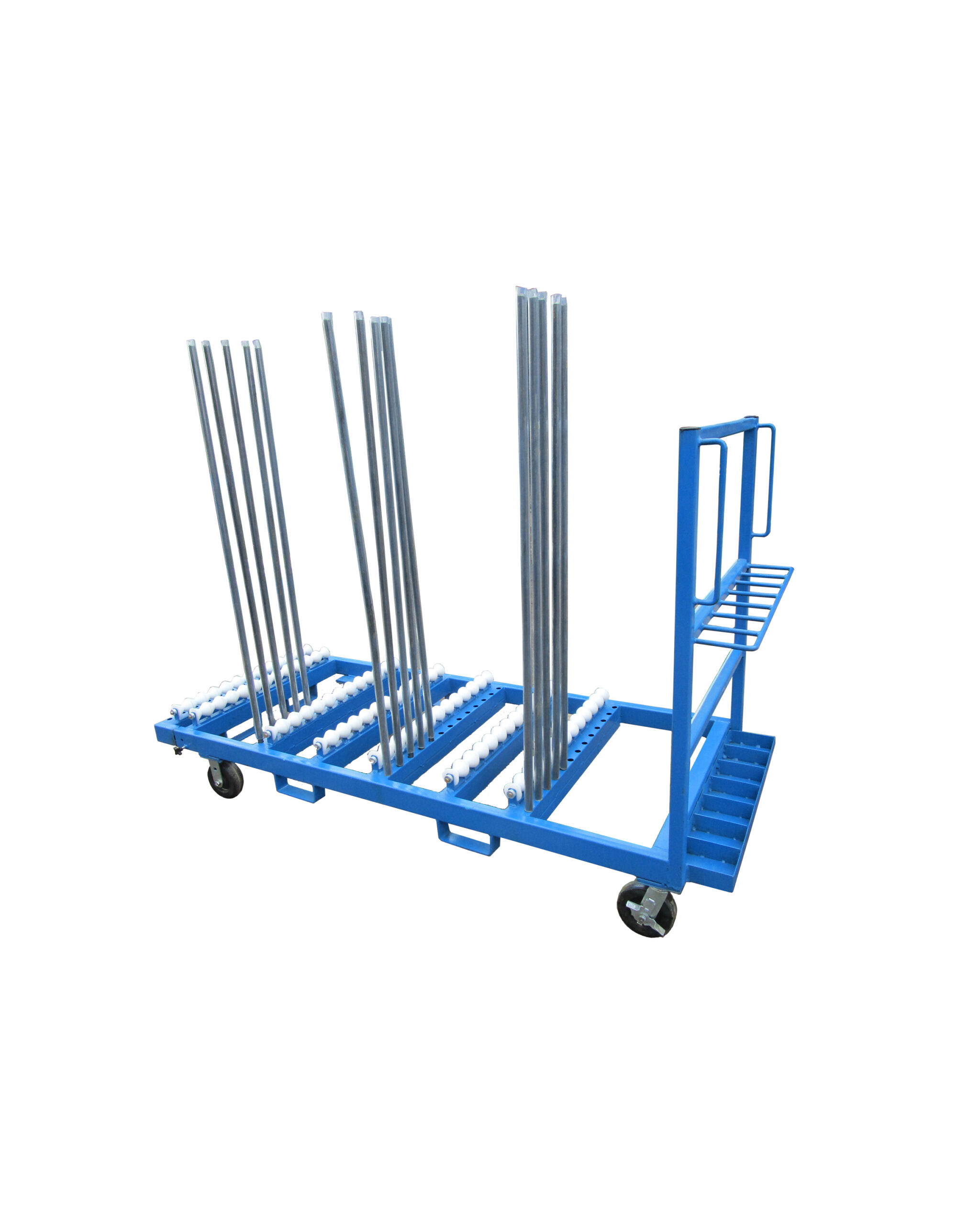 To ensure effortless mobility, the dolly is equipped with a push handle and customizable casters. The standard phenolic casters provide reliable movement on smooth surfaces, while optional pneumatic tires and rubber casters offer enhanced performance on rough or uneven floors. This combination of efficiency, durability, and adaptability makes the IG Dolly with Removable Posts an ideal choice for manufacturers looking to optimize IG storage and handling. With its robust construction and thoughtful design, the dolly ensures that insulated glass units are safely and efficiently managed throughout the production and transport process.